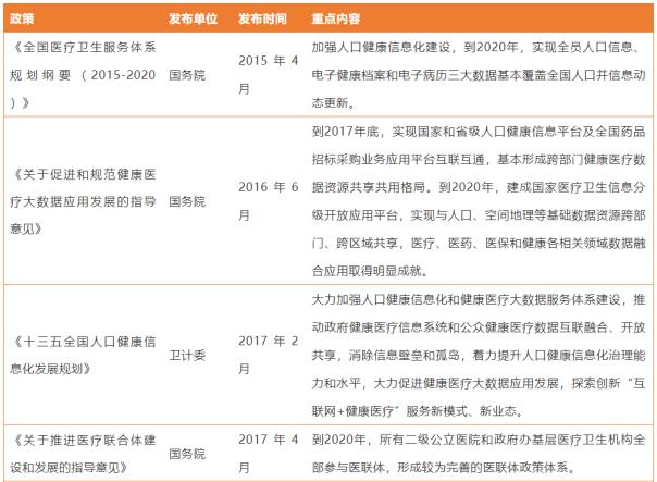 事實上,自2015年4月,國務(wù)院發(fā)布《全國醫(yī)療衛(wèi)生服務(wù)體系規(guī)劃綱要(2015-2020)》,提出加強人口健康信息化建設(shè),到2020年,實現(xiàn)全員人口信息、電子健康檔案和電子病歷三大數(shù)據(jù)基本覆蓋全國人口并信息動態(tài)更新,我國陸續(xù)出臺了一系列加速醫(yī)療信息化產(chǎn)業(yè)發(fā)展的政策。
